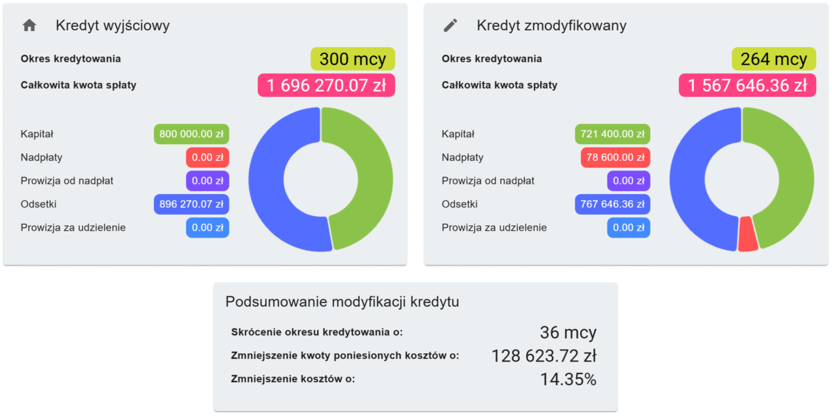 Zakładając kredyt w wysokości 800.000 zł na 25 lat z oprocentowaniem 7% i równą ratą, comiesięczna nadpłata w wysokości 300 zł, która skraca okres kredytowania, daje ponad 128.000 zł oszczędności na odsetkach. Do tego masz kredyt spłacony 36 miesięcy wcześniej.