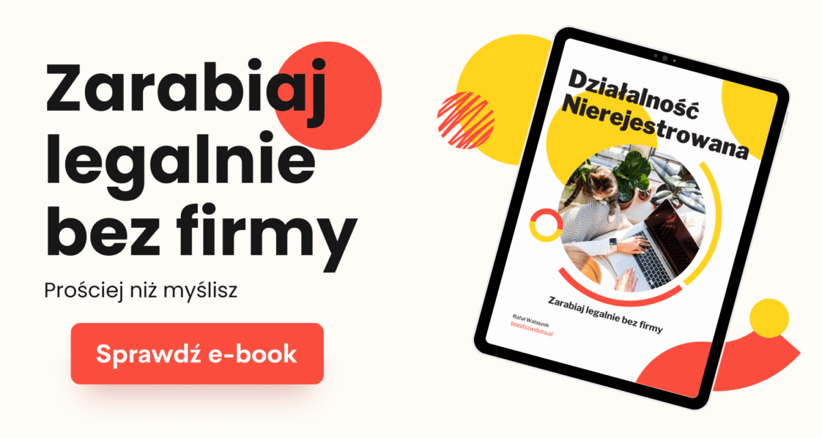 Jeśli przeczytałeś już wszystko, ale wciąż masz wątpliwości, jak prowadzić działalność nierejestrowaną w praktyce albo po prostu wolisz mieć wszystko jasno wyjaśnione w jednym miejscu, to koniecznie sięgnij po mojego e-booka „Działalność nierejestrowana — zarabiaj legalnie bez firmy”.