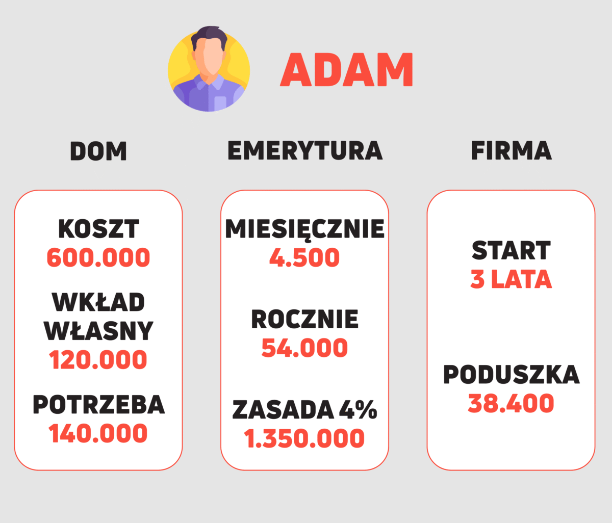Ale Adam chce także zrezygnować ze swojej pracy w ciągu najbliższych 3 lat, aby zająć się czymś, co sprawia mu więcej przyjemności i planuje otworzyć swój biznes. Wie jednak, że aby to zrobić, musi zbudować solidną poduszkę finansową, która pozwoli mu nie tylko na utrzymanie się, ale też na pokrycie nowych kosztów, związanych ze startem własnej firmy.