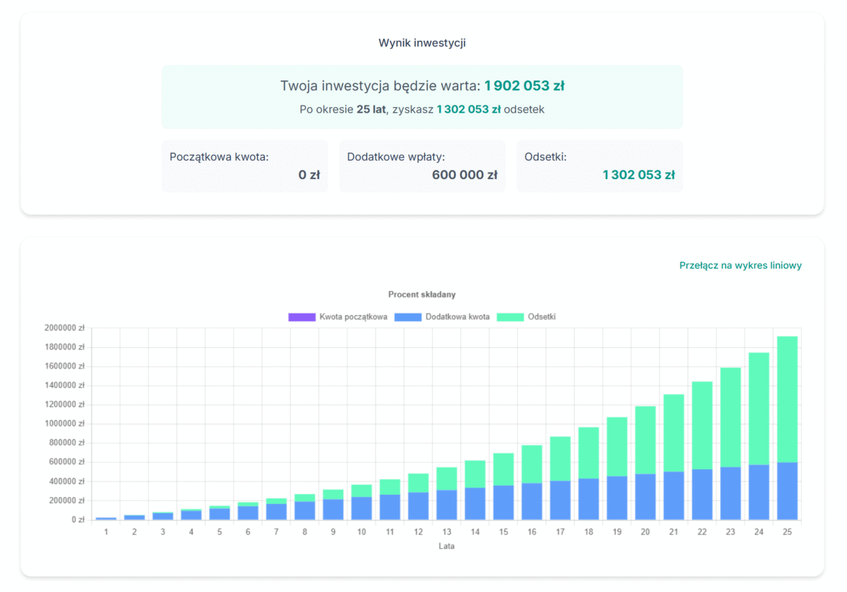 W ten sposób, do swoich 50 urodzin wpłaci na konto 600.000 zł, ale jego portfolio osiągnie wartość 1.902.053 zł. Dużo więcej niż wynikałoby z zasady 4%, dla której na początku wyliczyliśmy niezbędną kwotę na 1.350.000 zł.